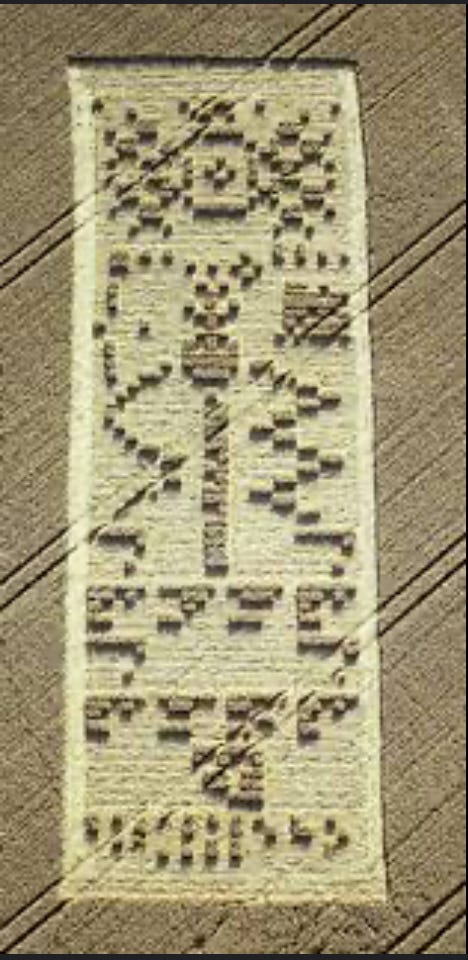 A short quarter century later, many believe, a response was received in the form of two crop formations that appeared in Britain in 2001 A crop formation known as the Arecibo Answer crop circle or more widely as the Chilbolton crop circle appeared in a field in England on August 16 2001, and was seen by many researchers and enthusiasts as a response to the original Arecibo message. The formation was a near replica of the message, but with some differences that have fueled speculation and debate about its origin. It was a large rectangular pattern, and when viewed from the air, it appeared to be a direct, binary encoded reply to the Arecibo message. It mirrored the original Arecibo message’s format (a 23x73 grid) but with alterations in the information conveyed.